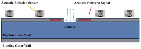 Acoustic-emission technology is achieved by monitoring the propagation of elastic waves generated by active cracks, leaks, or impacts. The schematic diagram is shown in Figure 4. This technology is a widely used passive non-destructive evaluation-monitoring technique that enables global and real-time monitoring of pipelines. In addition, it can also achieve defect location positioning. This technology is primarily used for identifying pipeline leakage and damage, with relatively little research focused on pipeline blockage status. Juliano et al. [] successfully applied acoustic-emission technology in practical pipelines to identify and locate locations of pipeline leakage. Mostafapour et al. utilized acoustic-emission technology to analyze and locate the leakage location of high-pressure pipelines in indoor experiments. They validated this conclusion through mathematical modeling. Strei et al. [] achieved the accurate positioning of leakage locations in liquid-filled pipelines by increasing the number of sensors and employing triangulation methods. Currently, the primary limitation of acoustic-emission technology is the need for a significant number of sensors to cover the entire length of long-distance transportation pipelines. This requirement increases the cost of pipeline monitoring and makes it impractical for practical engineering purposes.