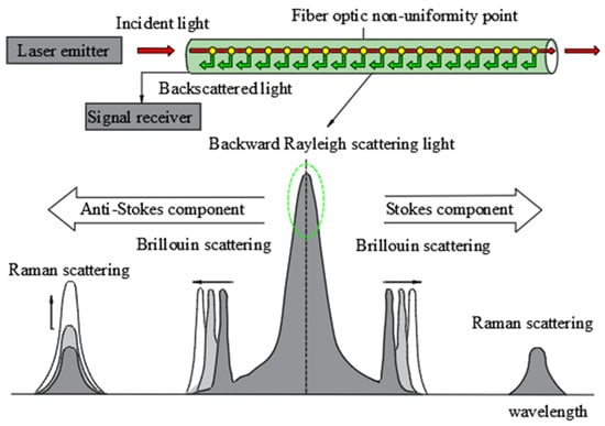 According to the working principle of OTDR technology, it is based on backscattering. Backscattering can be further divided into Rayleigh scattering, Brillouin scattering, and Raman scattering []. Among them, Rayleigh scattering is a phenomenon caused by the inhomogeneity of the refractive index of the optical fiber resulting from the inhomogeneity of its own material. Raman scattering, on the other hand, is caused by the interaction between light and matter molecules, resulting in the production of optical phonons. Brillouin scattering, on the other hand, is caused by the periodic change in the density of the optical fiber material, resulting in the production of acoustic phonons. The three scattering modes in distributed optical fiber-sensing monitoring are shown in Figure 5. It can be seen from the figure that in the backscattering of light, the intensity of Rayleigh scattering is high. When the optical fiber is disturbed by an external physical field, the intensity of backscattered light will decrease significantly. Therefore, it is possible to monitor the disturbance of the optical fiber by measuring the change in backscattered light intensity. Relatively speaking, Brillouin scattering and Raman scattering have low light intensity, which makes them unsuitable for measuring changes in light intensity. However, when considering the relationship between the frequency shift and the changes in temperature and strain, it is common practice to monitor the variations in external temperature, strain, and other factors by measuring the frequency shift in these two types of scattering methods. Gao et al. [] used an optical time domain reflectometer (OTDR) to monitor the safety of buried oil and gas pipelines, reducing the range for locating damaged points to 22.4 m. Qu Zhigang and his team developed an early warning system for detecting oil and gas pipeline leakage using a Mach Zehnder optical fiber interferometer. They also established a corresponding monitoring system that can identify pipeline leakage and other abnormal conditions. Stajanca and others applied the distributed acoustic-sensor monitoring (DAS) system to monitor the gas leakage in the pipeline.