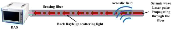 Distributed Fiber Optic Sensing (DFOS) technology has several advantages, including long-distance sensing, a strong anti-interference ability, good continuity, and strong real-time performance []. It can perceive multiple parameters such as deformation, temperature, vibration, etc. It has gradually become widely applied in various fields, including pipeline transportation, roads and bridges, steel structures, and geotechnical and geological engineering. It has also emerged as one of the important technologies in pipeline transportation monitoring []. Distributed fiber optic-sensing technology can be divided into two categories based on principles: scattering and interference []. The fiber optic-sensing technology, based on the scattering principle, can be divided into three categories according to the different types of backscattered light: Rayleigh scattering, Brillouin scattering, and Raman scattering []. In various types of distributed fiber optic-sensing monitoring, fiber optic-distributed acoustic sensing (DAS) technology, which is based on backward Rayleigh scattering, is increasingly being used for pipeline transportation status monitoring [].