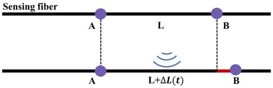 Referring to the DAS measurement schematic diagram shown in Figure 7, it is assumed that there are two points on the optical fiber: Points and . The distance between them is . Suppose that the backscattered signals corresponding to Points A and B have Amplitudes and respectively, and Phases , . However, if the fiber is interfered with between two points, the Phase Difference of the backscattered signal between the two points is directly proportional to the elongation of the optical fiber between the two points []. The corresponding mathematical relationship is as follows:
