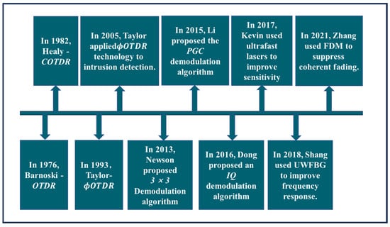 In 1976, Barnoski et al. [] first proposed optical time domain reflectometry (OTDR) technology based on the design concept of lidar and applied it to monitor optical path loss in optical fiber transmission. Since the OTDR technology cannot respond to the phase-modulation information caused by interference events, i.e., the sensitivity of the signal is not high, Healy et al. [] proposed the concept of coherent OTDR (C–OTDR) technology in 1982 to further improve the system performance. In 1993, Taylor et al. [] proposed a highly sensitive phase-sensitive OTDR (), DAS began to enter the qualitative-monitoring stage. In order to extract the relevant information from external physical quantities, coherent demodulation technology is proposed to demodulate the internal interference signal. In 2013, Newson et al. [] proposed a method that utilizes 3 × 3 phase demodulation of a coupler. In 2015, Li et al. [] proposed a demodulation method for the phase-generated carrier (PGC). In 2016, Rao et al. [] used the IQ demodulation method to process the optical fiber tensile-deformation signal, which marked the entry of DAS into the field of quantitative monitoring. At present, DAS technology has achieved significant development due to improvements in polarization fading, coherent fading, spatial resolution, frequency response, signal-to-noise ratio, detection range, and other performance indicators []. The development history of DAS is shown in Figure 8 below.