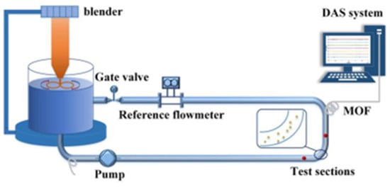At present, the current research on pipeline-health monitoring based on Distributed Acoustic Sensing (DAS) primarily focuses on indoor experiments and engineering trials. Li et al. [] designed an experimental device for measuring sediment concentration. The device includes a solid–liquid two-phase flow-circulation system and a sensing system, which enables real-time monitoring of the sediment concentration in the flow using DAS technology. The experimental device is shown in Figure 9 below. The team improved the strength of the backscattered signal by installing continuous micro-optical fiber structures along the axial direction of the optical fiber. They also amplified the signal of sand collision by utilizing the elbow structure. The experimental results show that this method has the potential for application in real-time monitoring of sediment concentration in long-distance, non-invasive pipelines. The team also designed a distributed acoustic sensor based on flow-induced vibration to monitor pipeline flow. The system diagram is shown in Figure 10 below.