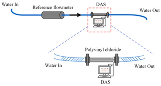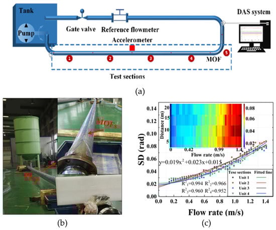 The final results show that there is a quadratic relationship between the flow velocity and the standard deviation of the noise signal caused by flow-induced vibration []. In addition, the team utilized a novel distributed microstructure optical fiber acoustic sensor (MOF–DAS) to achieve the monitoring of pipeline flow through the Flow-induced Vibration (FIV) principle. This research is considered to be the first time that Distributed Acoustic Sensing (DAS) has been applied to non-invasive pipeline-flow monitoring. The system diagram is shown in Figure 11 below.