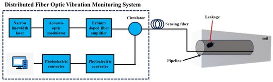 In the early days, manual visual inspection, periscope monitoring, and other methods were often used to monitor the condition of pipelines. The use of simple tools for pipeline monitoring offers the advantages of convenience, speed, and low cost, making them widely used in pipeline inspections. However, monitoring of the pipeline is primarily focused on post-accident or post-problem situations, resulting in a certain degree of lag []. In addition, traditional methods of monitoring pipelines heavily rely on the staff’s work experience, and most of the monitoring equipment used is expensive and not easily portable []. With the continuous progress of monitoring technology, pipeline monitoring has transitioned from manual to intelligent machines. At present, the main methods for pipeline monitoring at home and abroad include the pipeline closed circuit television method [], the negative pressure-wave method [], infrared thermal imaging [], and some methods that rely on acoustic principles for monitoring. However, these methods have limitations, such as limited measurement distance, high equipment prices, and the possibility of missing inspections. In addition, as the total mileage of the pipeline continues to increase, it becomes particularly important to monitor the overall transportation status of the pipeline []. It is challenging to achieve real-time monitoring of long-distance pipeline transportation status using traditional pipeline-monitoring methods. Therefore, there is an urgent need for a long-distance, fully covered, and real-time pipeline monitoring and measurement scheme that can identify and warn of abnormal situations in pipeline transportation in real time, as well as locate abnormal locations.