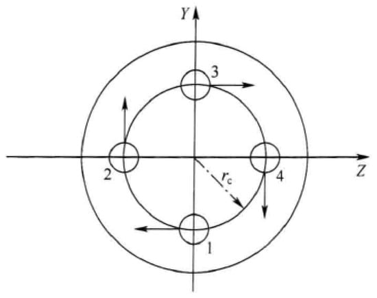 The engine numbering sequence and the positive direction of the swing angle are shown in Figure 1, and the direction of the engine swing angle is defined as positive clockwise deflection when viewed from the tail end of the rocket [26]. When the swing engine swing angle is , the equivalent swing angle of the three channels can be regarded as