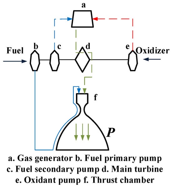The rocket engine model shown in Figure 2 mainly consists of the main turbine pump, a pre-pressurized turbine pump, a gas generator, a thrust chamber, valves, piping, and other components, liquid oxygen through the oxygen pre-pressurized turbine pump, the oxygen main pump, and the liquid oxygen main valve into the gas generator; the generator produces a high-temperature oxygen-rich gas to drive the main turbine after the gas conduit into the combustion chamber after the make-up combustion [10]. Fuel kerosene is pressurized by the fuel pre-pressure pump and the fuel primary pump and divided into four ways, most of which enters the combustion chamber through the cooling channel of the thrust chamber, a part of which flows into the gas generator and the ignition path of the thrust chamber after increasing the pressure by the fuel secondary pump, another part of which drives the fuel pre-pressure pump and then flows into the main path, and the last part of which drives the servo mechanism.