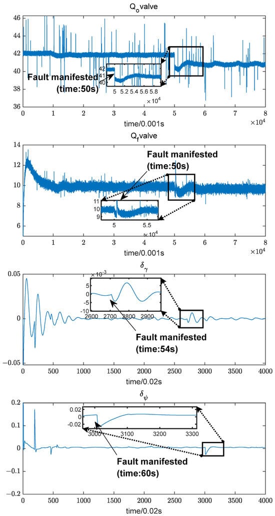 The simulation time is set to 80 s and the combustion chamber throat ablation fault is injected inside the engine at 50 s. This fault is more frequent in the rocket engine, which may lead to the damage of the combustion chamber structure, the spalling of the material, and even the failure of the rocket engine. So this fault, as a typical fault of the engine, has a certain degree of representativeness to carry out research on it.