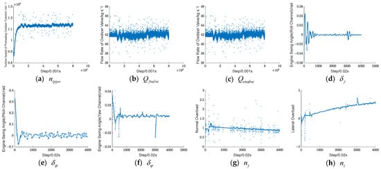 A typical fault, the oxidizer pre-pressurized turbine blade ablation fault, is used as an example to compare the parameters of the two systems at 50 s when the fault occurs. As shown in Figure 3, the engine parameters can characterize the occurrence of the fault in time. Still, its internal parameters fluctuate considerably, affecting the characterization of the abnormal state inside the power system. The control system parameters are slower to characterize the fault but are more stable and can indirectly reflect the thrust change. In summary, integrating power system and control system parameters can accurately and quickly characterize the occurrence of faults.