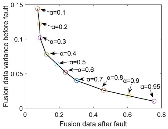 The first term in Equation (5) is the fusion objective 1, which evaluates the fluctuation of the fused data by estimating the variance of the fused data and ensures the convexity of the objective function by constructing a quadratic form; the second term of Equation (5) is the fusion objective 2, which combines the constraint term to maximize the difference in the post-fault data. There are three hyperparameters in Equation (5), where and act together to adjust the importance of the two optimization objectives, and acts together with the parameter to adjust for differences in the post-fault data. The hyperparameters and are obtained by empirical analysis, and the sum of these two parameters is a constant, so the appropriate parameter ratio can effectively adjust the optimization effect.