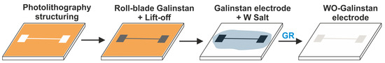 Galinstan electrodes were fabricated using photolithography, followed by brushing Galinstan on the exposed areas and removal of the remaining photoresist, as shown in the schematic overview in Figure 1. The electrodes were then subjected to GR in 10, 50, 100, 200, and 400 mM W salt solution for 24 h, which was determined by studying the effect of the different concentrations (10, 50, 100, 200, and 400 mM) of W salt on 10 µL of Galinstan droplet for a set period of 24, 48, and 72 h (Figure A1).