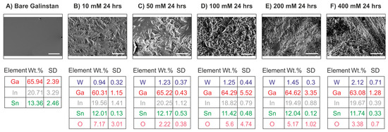 SEM images of an untreated bare Galinstan electrode and a galvanically treated WO-Galinstan electrode in different W salt concentrations for 24 h along with the corresponding EDX spot scan data. (A–F) Representative EDX spot scan data and the corresponding elemental composition mean in wt.% for four measured spots on each sample with the standard deviation, indicating a gradual increase in the W amount with the highest W amount for the 400 mM W salt-treated Galinstan electrode (Scale bar: 10 µm).