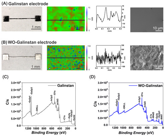 The WO-Galinstan electrode was whitish in appearance (Figure 3B) in comparison with the shiny Galinstan pattern (Figure 3A), indicating a definite change post GR. We further characterized the surface roughness of the Galinstan and WO-Galinstan electrodes, fabricated via lithography (Figure 3A,B) using WLI analysis. The Galinstan electrode exhibited a surface roughness Ra of 42 nm, indicating a smooth surface as seen in the SEM image (Figure 3A); whereas the WO-Galinstan electrode had a surface roughness Ra of 193 nm, clearly representing a rough profile and supported by the roughened SEM image (Figure 3B). Furthermore, the Galinstan pattern showed a mean thickness of 1.93 µm ± 0.5 µm, while the thickness of the AZ photoresist was 1.8 µm and the resulting Galinstan pattern post development had taller edges with more uneven areas across the pattern. The extracted surface profile and the WLI image confirmed that some topography exists; however, the overall surface as shown using SEM presented a smooth surface. Overall, the electrode quality looked similar to that reported by Park et al. [45]. On the contrary, the WO-Galinstan electrode had a thickness of 2.68 µm ± 0.8 µm, which is around 0.75 µm greater than the pristine Galinstan electrode, indicating that 24 h immersing in 400 mM W salt resulted in a WO layer with thickness of ~0.75 µm. In addition, we conducted XPS survey scans on Galinstan and WO-Galinstan electrodes and observed that the WO-Galinstan pattern showed a W4f peak at 34 eV in addition to the O1s peak at 530 eV, where a Ga2p1 peak at 1144 eV was observed for the untreated Galinstan pattern (Figure 3C,D). The atomic % data retrieved from the XPS scans further confirmed the presence of 4.78 at. % W4f for the W salt-treated sample, with a ~13 at. % increase in O1s and a ~17 at. % decrease in Ga2p1 in comparison with the untreated sample (Table 1). The SEM-EDX and XPS data for the electrodes and the EDX data for the exfoliated skins, along with the XRD data for droplets (Appendix A), suggest that the resulting WO-Galinstan electrodes are composites of Galinstan (electrode core) and WO (surface), since no LM-WO phases were observed in the XRD plot (Figure A4). This confirms the successful GR of Galinstan to WO-Galinstan electrodes with a definite change in the surface morphology.