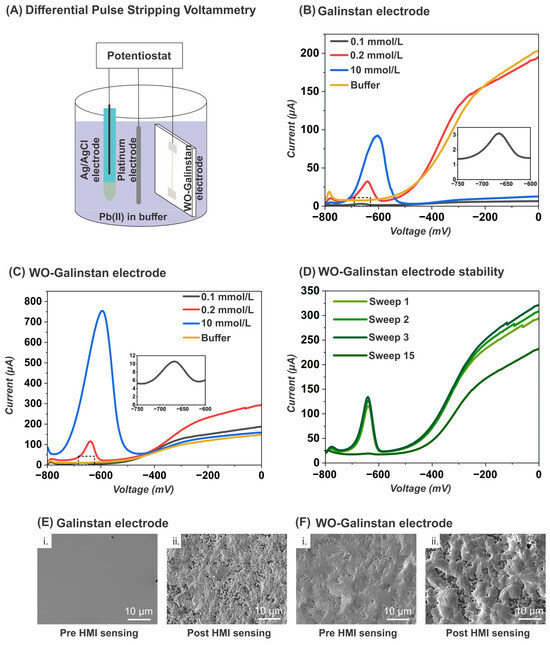 Differential Pulse Stripping Voltammetry (DPSV) experimental setup for Lead (II) detection. (A) DPSV setup schematic with the WO-Galinstan electrode as a working electrode, Ag/AgCl as reference electrode, and platinum wire as a counter electrode, with a positive scan of −800 mV to 0 mV at 3 mv·s−1. (B,C) The resulting DPSV voltammograms with the corresponding output current for Lead (II) concentrations of 0.1, 0.2, and 10 mmol·L−1 and buffer solution for the Galinstan and WO-Galinstan sensors, respectively. (D) Recorded current stability for three consecutive sweeps compared with the fifteenth consecutive sweep for the detection of 0.2 mmol·L−1 Pb2+ with the WO-Galinstan electrode. (E,F) SEM images indicated a definite change in the surface morphology of the Galinstan and WO-Galinstan electrodes pre (i) and post HMI (ii) sensing, respectively.