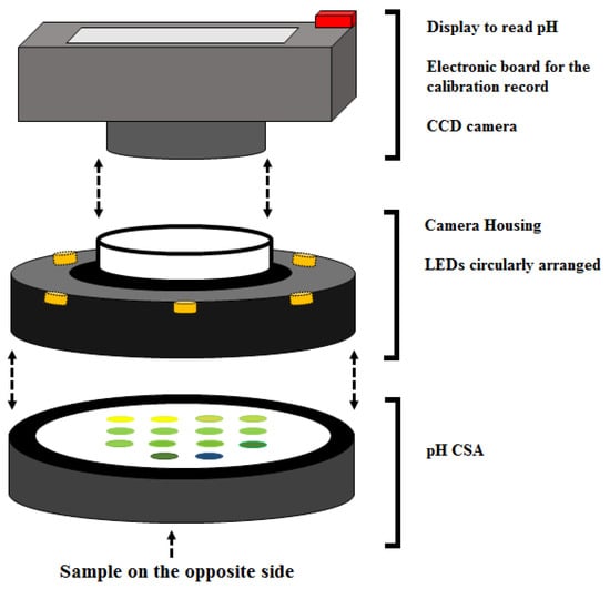 The device to detect pH is based on the reading of the H parameter from the HSV color space as the analytical signal. The scheme of the measurement cell is reported in Figure 1. The pH meter consists of: (I) a nitrocellulose membrane impregnated with a pH-sensitive gel (77 spots); (II) a CCD camera for the detection of the color; (III) an electronic board containing the calibration profiles in terms of H as a function of pH, and (IV) a display to read the pH of the samples.