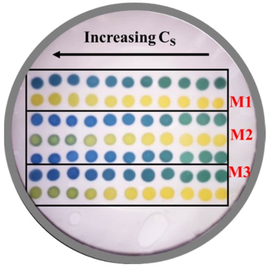(M1) Spots #1–22: the first row contained BCG at : 0.511 (three times), 0.345, 0.234, 0.174, 0.118, 0.063, 0 M (three times); the second row contained BB at : 0.513 (three times), 0.338, 0.242, 0.174, 0.117, 0.064, 0 M (three times). The nitrocellulose membrane was impregnated with a sol–gel solution prepared by acidic hydrolysis of TEOS (14.56 g of TEOS, 7.28 g of Milli-Q water, 0.21 g of HCl 1 N). After 45 min of magnetic stirring, the sol became clear, and the total amount was separated into two vials with 10.08 g of the sol. In one of these, 2.016 g of CTApTs was added. The intermediate concentrations were obtained by a suitable mixture of the two gels. For each value, a mixture of 1.04 g of sol and 0.87 g of ethanolic solution of the indicator was prepared. The mixture amount used for each spot was 95 µg.