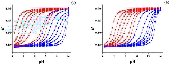 Figure 3 shows the calibration profiles of 14 spots of the M2 sensor array (as an example) in terms of H vs. pH. Seven of them contained BB (●) and seven contained BCG (■). The surfactant concentration in the spots decreased from left to right. The two representations referred to the response of the sensor to pH buffers prepared at different ionic strength values: namely, 0.061 M (a) and 0.397 M (b), respectively. There was a quite evident pH shift of both indicators, but it was more important for BCG. The pH shift indicated a variation of the caused by a series of factors connected to the interaction of the anionic species present in the buffer and the deprotonated silanols of the sol–gel with the cationic head of the surfactant confined inside the polymer network. These interactions, in turn, were reflected in the different behavior of the acid–base indicator, that is the variation of the [43,48]. The overall conclusion was that if the sensor was calibrated in the conditions of Figure 3a, but the real sample had the ionic strength of Figure 3b, the pH measurement was wrong. For this reason, a correction strategy was necessary.