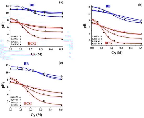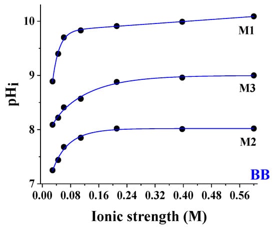 Figure 5 describes the shift in the experimental values (●) with the buffer concentration for M1, M2, and M3. Here, we referred to the single spot containing BB having = 0.53 M chosen as the worst case (largest pH variation with salinity). The salt effect was characterized by a plateau after 0.160 M (Figure 6), so the dependence of the ionic strength for M2 and M3 was negligible and suggested applications in seawater (20–38 g/L) without the need for correction algorithms. Below 0.160 M, the shift due to the salt effect was larger in the case of M1 (1.10 pH units vs. 0.55 pH units in M2).