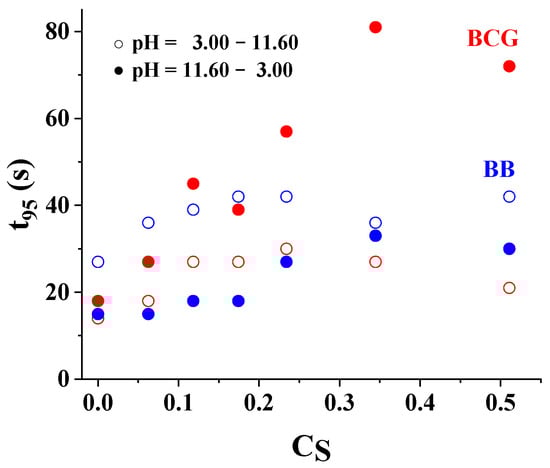 The values (time required to reach 95% of the acidic/basic plateau) for BCG and BB spots in M2 vs. are reported in Figure 6 at 0.397 M buffer concentration. The open circles (○) indicate the values referred to the transitions between pH = 3.00 and 11.60. The reverse transition is indicated with the black circles (●). The behavior in the two senses is not symmetric. Generally, the transition from the acidic to the basic environment was less affected by the surfactant concentration and thus by the pH working interval of the spots. The spots with larger values were characterized by slower return times, since the ion pair between the deprotonated form of the indicator and the cationic head of the surfactant represented an obstacle to the diffusion of the protons.
