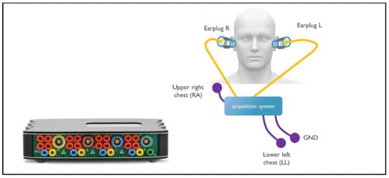 An overview of the experimental setup is shown in Figure 1. The g.USB amp biosignal amplifier (g.tec medical engineering GmbH, Schiedlberg, Austria) was used as a data acquisition platform to capture the biosignals from the 2 earplugs and from 3 electrodes on the chest at a sampling rate of 256 Hz. The frontal ECG lead II was captured with standard off-the-shelf (OTS) electrodes (Kendall 200 Series Foam Electrodes, Cardinal Health, Dublin, OH, USA) between the right arm (RA) and left leg (LL) and 1 grounding electrode and used as the reference for the other measurements. Each earplug captured 6 channels of bioelectric activity in the ear. Through various configurations, ECG could be acquired between the ears and LL, between the 2 ears, and within the ears (see Section 2.4 for details). A headband was used to give additional support to the earplug and the cables attached to it, which minimized changes in earplug position and pressure during data acquisition. This measurement setup was chosen for its versatility and the possibility of selectively configuring the different channels. As the aim of this study was to evaluate the performance of the electrodes only, it was important to eliminate sources of perturbation from the measurement setup by choosing research-grade equipment. The development of capture electronics for in-ear ECG could be the subject of future research.