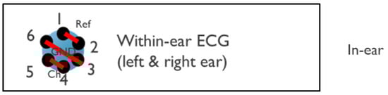 This approach paves the way for unobtrusive, long-term, and low-power ECG acquisition. Between the ears, the horizontal EOG could be acquired together with a small-amplitude ECG, although the latter was with large inter-subject variability. The ECG measured between the ears is smaller in amplitude and has a lower SNR, which is likely due to the distance to the heart and the volume through which the ECG wavefront needs to propagate. Regarding the within-ear ECG, satisfactory low noise levels are observed in our hardware setup, which should have been enough to capture an ECG with an amplitude around 10–15 µV pp reported in the literature [23]. However, this was not the case. To further investigate this, future studies should control accurately the positioning of the bipolar in-ear measurements to gain a deeper understanding of the possibilities in this case.