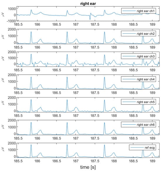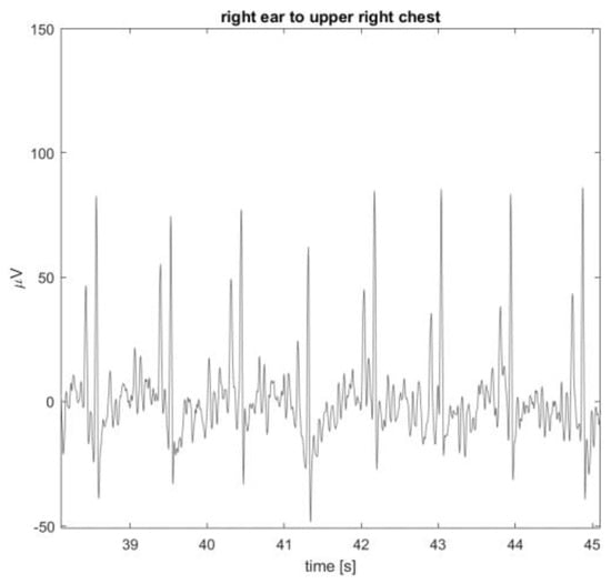 The ears seem to be a suitable location for capturing biosignals, as demonstrated in this work, where we use multi-lead SoftPulseTM earplugs with six integrated leads, as well as from the literature [3,4,5,6,7,8,9,10,18]. When referenced to another measurement point on or below the neck, it could be possible to capture a high-quality bipolar ECG between the ear and the other measurement point. For example, the earplug cable could be lying on the neck and be made conductive, allowing for a bipolar measurement between the ear and neck. In Figure 11, a data example for this scenario is shown, depicting the ECG signal measured between the right ear (earplug) and upper right chest on top of the collar bone. QRS peak amplitude increased with inter-electrode distance, in this case, to approximately 110 µV pp.