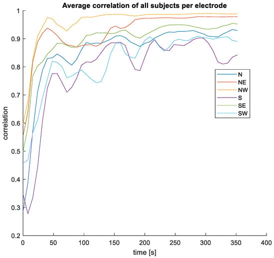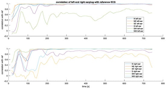 Figure 5 shows an example of the raw unfiltered measurements taken in the first configuration. Figure 6 shows the correlation over time between the earplug measurements and the reference signal. In Figure 6, the earplug channels are remapped according to their position in the ear. As can be seen in the example, the correlation is high for most of the channels, especially after allowing a settling time of a few minutes. From all correlation and raw signal plots, three typical behaviors are observed: (1) some electrodes have a high correlation with the reference signal directly after inserting the earplug, (2) other electrodes need a settling time of typically 1–3 min, and (3) others never have a high correlation. For most measurements, one or two electrodes at the bottom position (South) show bad correlation values. Average correlation values are depicted in Figure 7. The correlation values at the end of the recording are 0.93, 0.98, and 0.99 for the topmost electrodes (N, NE, and NW electrodes, respectively) and 0.84, 0.95, and 0.89 for the bottommost electrodes (S, SE, SW electrodes, respectively). After examining the disparities between the left and right ear, no notable differences were observed in terms of SNR or correlation values.