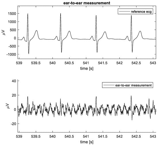 Example of ear-to-ear ECG data captured for 1 subject. Reference ECG (top plot) and ear-to-ear measurement (bottom plot).