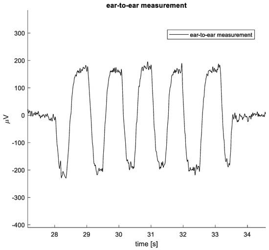 The QRS amplitude of the ECG measured between the left and right ear was approximately 25 µV for one subject and 50 µV for two subjects. For the other two subjects, no QRS peak was detected. An example of the ECG measured between the ears is shown in Figure 8’s bottom graph. Overall, the noise level of the setup is low enough to allow us to notice distinct ECG beats, although the noise of various origins can be present. The example clearly shows the distinct ECG beats with 6 Hz sinusoidal noise present, most likely an aliased component. The eye activity (EOG) can also be picked up during ear-to-ear measurements. Horizontal eye movements created a signal between the ears with an amplitude of approximately 400 µV pp (see also Figure 9). Here, the subject moved the eyes as far as possible from left to right several times.