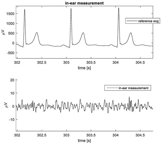 Example of data captured during the in-ear data collection. Top: Reference lead II ECG. Bottom: In-ear data.
