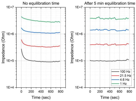 Equilibration time for impedance stabilization of SoftPulseTM soft dry electrodes coated with silver–silver chloride-based coating.