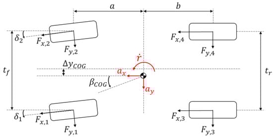 - Wheel moment balancewhere the increasing values of the integer , with 1,…, 4, used as a subscript, refer to the front left, front right, rear left, and rear right vehicle corners; and are the longitudinal and lateral accelerations; and are the longitudinal and lateral components of the vehicle velocity; and are the longitudinal and lateral tyre forces; is the steering angle of the -th wheel; is the yaw rate; is the aerodynamic drag force; indicates the lateral position of the centre of gravity with respect to the plane of symmetry of the vehicle; is the tyre self-aligning moment; is the equivalent mass moment of inertia of the wheel; is the angular wheel acceleration; is the electric motor torque level referred to the -th corner, computed from the measured motor current, the gearbox and final drive ratios, as well as the respective efficiencies; indicates the braking torque at the individual corner, which is estimated from the measured tandem master cylinder pressure; is the laden tyre radius; and is the rolling resistance moment.