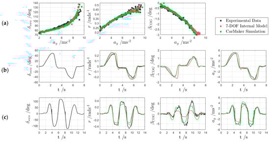 Examples of experimental validation of the CarMaker model and the internal UKF model on (a) a 40 m radius skid pad on dry tarmac; (b) a sinusoidal steering manoeuvre on dry tarmac, from ~80 kmh−1; and (c) a sinusoidal steering test at ~40 kmh−1 on an icy surface (t is time).