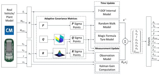 Several algorithmic solutions have been proposed to account for the vehicle system nonlinearities in the internal model of the filter. This can be typically achieved through extended Kalman filters (EKFs), which imply a linearisation at each time step, or unscented Kalman filters (UKFs), which directly use nonlinear models. Comparative studies of EKF and UKF performance for the same vehicle model, e.g., see [16,20,21,22,23,24], highlight the superiority of UKFs, towards which there has been a progressive shift [17].