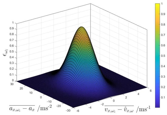 Figure 5 shows the adopted distribution as a function of and . varies between 0, indicating the presence of critical slip dynamics, and 1, indicating the absence of detected longitudinal slip criticalities. Based on (10), 1 corresponds to , i.e., the condition of maximum weight given to the wheel speed measurement, while 0 implies , i.e., the minimum significance given to the wheel speed signal. The use of a standard deviation approach in (11) enables the capture of the range of potential values and the likelihood of their occurrence within a normal distribution framework. This is particularly useful in the presented adaptation algorithm, in which the two variables are interrelated and exhibit a certain level of correlation in their behaviour [53].