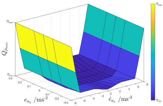 Extensive testing revealed a significant influence of the measurement covariance for , i.e., , on the adaptability and rate of change of , especially in scenarios characterised by high levels of lateral and/or longitudinal tyre slip. Consequently, for this covariance, a different adaptation strategy was developed, using a two-dimensional look-up table, based on two variables related to the lateral and longitudinal dynamics: (a) the moving average of the error between the lateral acceleration value estimated by the UKF and the one measured by the IMU, i.e., ; and (b) the time derivative of the moving average of the longitudinal acceleration error, , which is a good indicator of friction-related criticalities of the longitudinal vehicle dynamics.