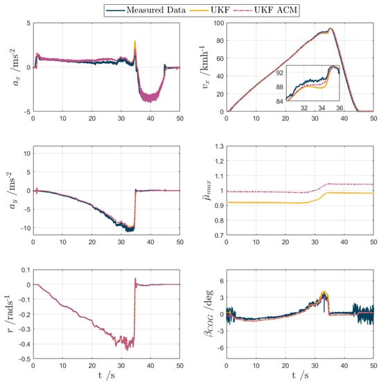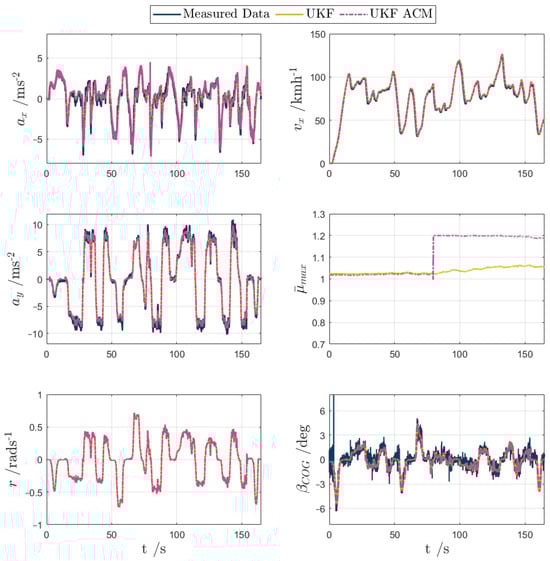 The performance of UKF and UKF ACM was analysed through the root mean square (hence, the subscript ‘rms’ in the following notations) values of the error between the UKF estimation outputs and the measured data. Hence, the resulting KPIs are (i) , the rms value of the estimation error of the sideslip angle at the centre of gravity; (ii) , the rms value of the longitudinal speed estimation error; (iii) , the rms value of the average estimation error on the slip ratios of the front tyres; and (iv) , the same as (iii), but applied to the slip ratios across the rear axle.