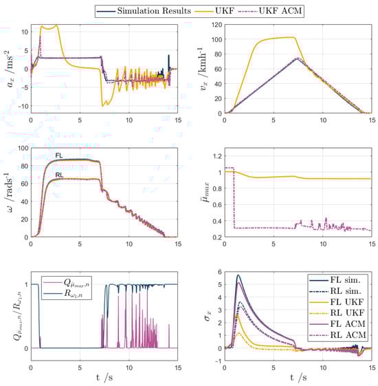 - A UKF implementation with vehicle-dynamics-based adaptive formulations for the following: (a) the wheel speed measurement covariances, based on variables that are robustly representative of the longitudinal tyre slip condition; (b) the tyre–road friction coefficient process noise covariance, based on error variables depending on the longitudinal and lateral accelerations; and (c) the process noise covariances of the yaw rate and the longitudinal and lateral velocity components, based on the estimation errors with respect to the available relevant measurements.