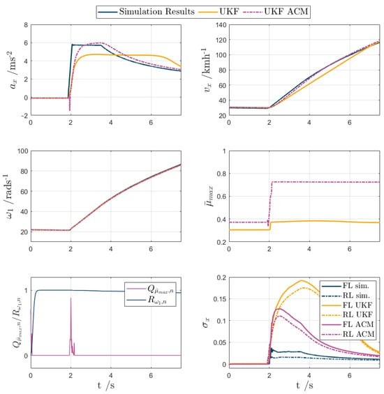 where and , with , are predefined thresholds; and the scaling factors , , and , with , are set to penalise excessive error values. The optimisation round only covered manoeuvres with extremely critical steady-state and transient longitudinal tyre slip conditions, and the resulting optimal value was set as . Further trial-and-error calibration of was implemented at the end of the overall filter adaptation mechanism tuning, by considering the adaptations of the other UKF covariances.
