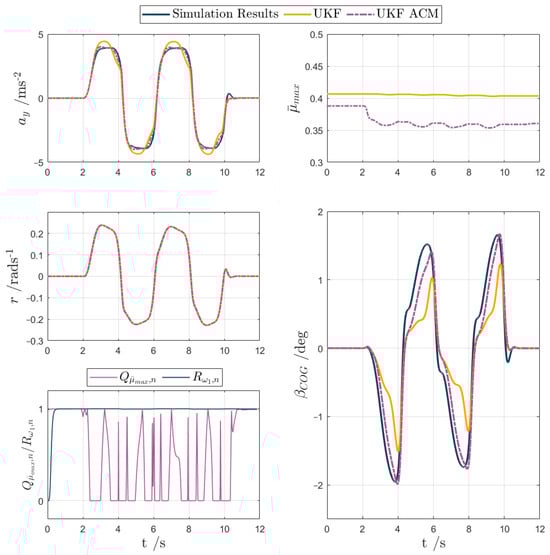 In summary, the formulation of the internal model of the filter is totally independent from the CarMaker model in Section 2.2. The very substantial differences in key aspects of the models (e.g., number of DoFs, load transfer formulations, magic formula version) also imply different model parametrisations. To make the UKF performance assessment more realistic and conservative, the model calibrations, based on the available vehicle data, did not involve any further optimisation to match the collected experimental results. The diversity in model arrangements and tuning setups makes the following simulation analyses realistic and indicative of the operational robustness of the UKFs.