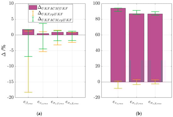 where indicates the KPI value for UKF, related to the estimation of the variable (with , , , ), for nominal parametrisation of the internal model of the filter; is the KPI value for UKF, referred to the estimation of the variable , for a variation of the internal model parameter indicated by the subscript ‘’ (i.e., robustness parameter, defined such that , , ) in the robustness analysis; and is the equivalent of for UKF ACM. Hence, and are the percentage variations of the estimation performance of UKF and UKF ACM with respect to the benchmarking UKF with nominal parametrisation.