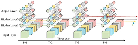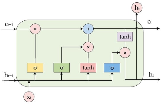 In Equations (13)–(16), denotes the previous hidden unit states, which are combined with the weights of the three units by elementwise addition to obtain the current unit state . Element-by-element multiplications between the input units, unit states, and output units of the hidden layer are denoted by symbols. The kernel function is represented using tanh and sigmoid functions. Equations (9)–(14) denote the computation of oblivion, input, and output cells, respectively. Equations (16) and (17) represent the current state of the memory and hidden units at time step t.