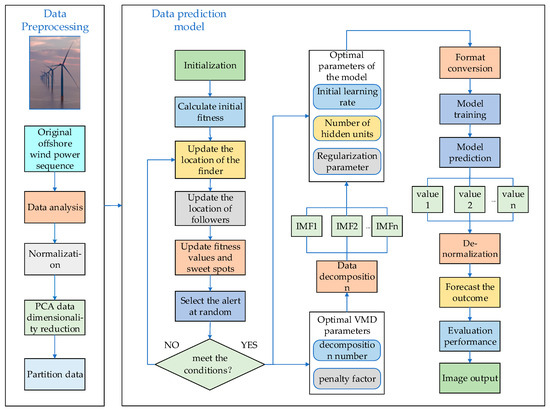 With the continuous promotion of the dual-carbon target and the requirement for high-quality economic development, China’s power system is undergoing a transformation towards a new type of power system based on renewable energy [1]. One of the most important forms of renewable energy is wind energy, which is highly favored by countries worldwide due to its non-polluting nature and unrestricted availability. As a result, the wind power industry is experiencing rapid development [2,3]. However, wind farm output is significantly influenced by environmental conditions. In comparison to onshore wind farms, offshore wind farms face rapidly evolving meteorological conditions and complex sea states with intermittent, volatile, and uncertain characteristics. While offshore wind farms provide clean energy to meet human needs, they also present new challenges for the safe and stable operation of the offshore power system [4,5]. Therefore, the development of a precise wind-power-forecasting model is crucial. Through comprehensive analysis of historical data using data mining techniques or machine learning algorithms, it is possible to extract pivotal information and trends inherent in the data. Such insights are instrumental in guaranteeing the economic viability, safety, and stability of offshore wind farms, thereby playing a vital role in the successful integration of wind power into the grid [6,7].