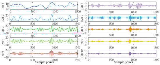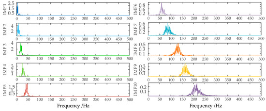 In order to ensure the quality of the input data and eliminate the influence of noise on the prediction, this paper decomposes the wind power input sequence by the VMD algorithm optimized by the SSA algorithm. Take the first quarter as an example. Firstly, the number of sparrow population is set to 30, the maximum number of iterations is 50, the number of variables is 2, the range of K value is [2, 10], the range of penalty factor is [500, 3000], the initial warning value is set to 0.6, the proportion of discoverers is 0.7, and the rest are joiners; then, SSA is used to optimize the VMD parameters. The iterative evolution results of the SSA algorithm are shown in the following figure. From Figure 6, it can be seen that the sparrow algorithm is gradually stabilized after the 8th generation of evolution, and the value of the optimal fitness function is 0.06261. The computational results show that the SSA algorithm’s solution speed and computational accuracy are better than the PSO algorithm. The optimal k and α values of VMD obtained by iterative calculation of SSA algorithm are [10, 2930]. Figure 7 shows the time-domain waveforms of the 10 IMFs decomposed by PCA-SSA-VMD. The spectrum obtained by performing Hilbert transform on the IMFs is shown in Figure 8. From the figure, it can be seen that the eigenfrequencies of the IMFs in different time domains are clearly distinguished and more regularly distributed, which effectively avoids the problem of modal aliasing.