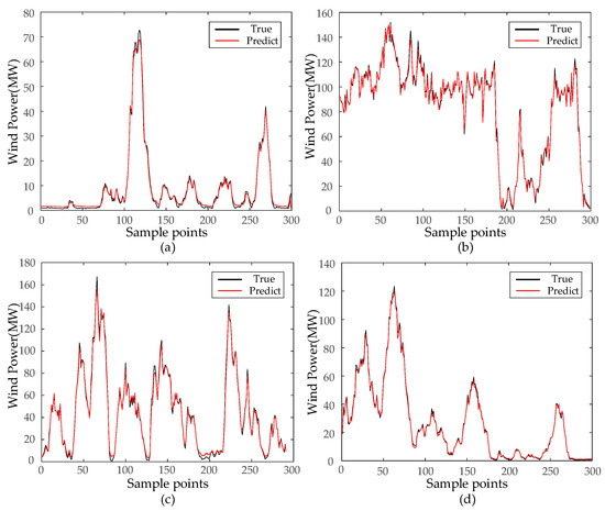 Each IMF’s prediction results are consolidated to derive the wind-power-prediction output values. As demonstrated in Figure 9, the PCA-SSA-VMD-BiLSTM model suggested in this research paper exhibits commendable training precision in offshore wind-power-prediction application, sustaining considerable stability amidst fluctuating offshore wind power data. Upon calculating each model’s evaluation index, the R2 reads 0.9954, nearing a value of 1. The RMSE, MAE, and MAPE values are recorded as 0.9741 MW, 0.7536 MW, and 2.76%, respectively.