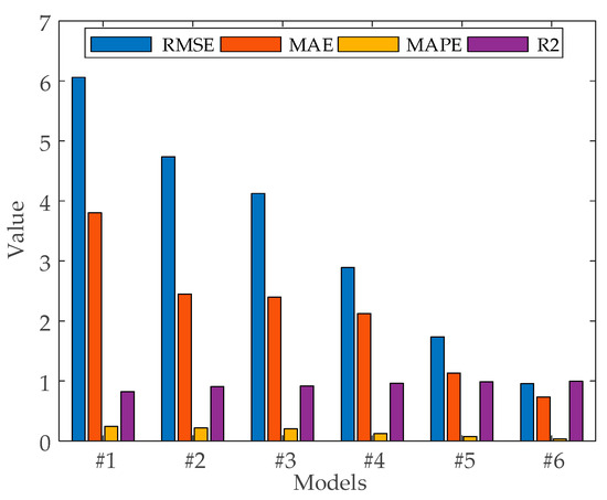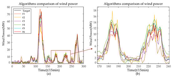 In order to verify the superiority of the PCA-VMD-SSA-BiLSTM wind-power-prediction model proposed in this paper, as well as to show that the combined prediction model proposed in this paper can significantly enhance and improve the accuracy of the wind power prediction, simulation studies have been carried out on the BP, LSTM, BiLSTM, SSA-BiLSTM, and VMD-BiLSTM models after data pre-processing, respectively, and the results are shown as follows for the first quarter as an example. In Figure 10, the black line represents the actual values, while the remaining six colored lines represent the predicted values, and the closer their positions are to the black line, the higher the prediction accuracy of the model. In the legend, #1 represents PCA-BP, #2 represents PCA-LSTM, #3 represents PCA-BiLSTM, #4 represents PCA-SSA-BiLSTM, #5 represents PCA-VMD-BiLSTM, and #6 represents PCA-SSA-VMD-BiLSTM. It can be observed that the original sequence is more volatile, with a larger gap between the peaks and the valleys, but the overall error of the prediction of each model is small, and it can basically reflect the trend of the sequence, whereas the line of the predicted values of the PCA-SSA-VMD-BiLSTM model is closer to the black line, which indicates that the prediction accuracy of the PCA-SSA-VMD-BiLSTM is higher. Figure 11 uses a Taylor diagram. It can be seen that the model proposed in this paper has higher correlation than other methods. Furthermore, the distribution predicted by PCA-SSA-VMD-BiLSTM is closer to the observed target value than by other methods.