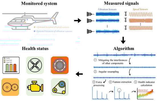 One common approach to condition-based maintenance in complex rotating machinery is the use of vibration analysis [6]. In this approach, as depicted in Figure 1, vibration sensors are installed near the rotating components of the system (e.g., a helicopter’s rotor, gear casing, etc.), and signal processing algorithms are employed to detect faults and classify their sources [7,8]. Once the fault is detected, maintenance actions can be taken to prevent the fault from deteriorating further. The algorithms employed among different rotating components typically rely on the same fundamental methods.