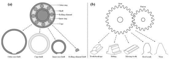 Examples of faults in rotating components: (a) examples of bearing faults; (b) examples of gear faults.