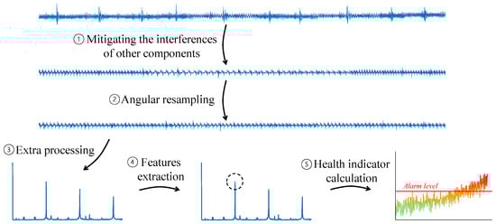 As illustrated in Figure 4, vibration analysis is generally utilized as follows: for each rotating component, (1) the algorithm isolates the component of interest, mitigating interferences from other sources then (2) angularly resamples the signal to be synchronized in phase, not in time, thereby ensuring a consistent number of samples in each cycle. After that, (3) additional operations are performed to improve the signal-to-noise ratio or highlight specific signal characteristics. (4) Features correlated with health status are extracted. Finally, (5) a health indicator classifies faults in the monitored component via the smart aggregation of features extracted from both the current record and healthy baseline records.