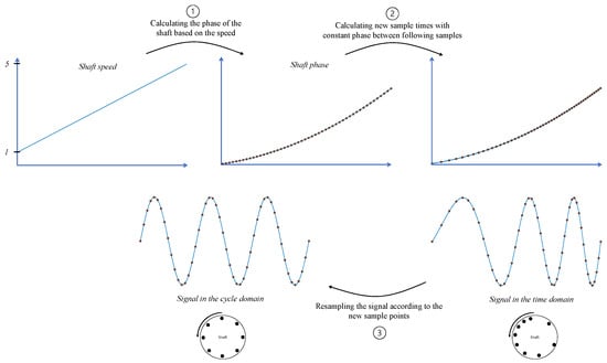To perform angular resampling, the phase of the shaft is calculated as a function of time, and then a new sample time vector is computed to maintain a constant phase interval between consecutive coordinates. Afterward, the vibration signal is resampled according to the new sample time vector. This process is described in Figure 5.