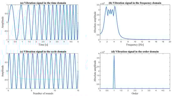 For example, as shown in Figure 6a, initially, the time interval between each pair of time steps is constant. The speed increases linearly from 1 Hz to 5 Hz. Consequently, the signal is smeared in the frequency domain, as can be observed in Figure 6b. As depicted in Figure 6c, in the cycle domain, the vibration is periodic, resulting in a sharp peak in the order domain, as shown in Figure 6d.